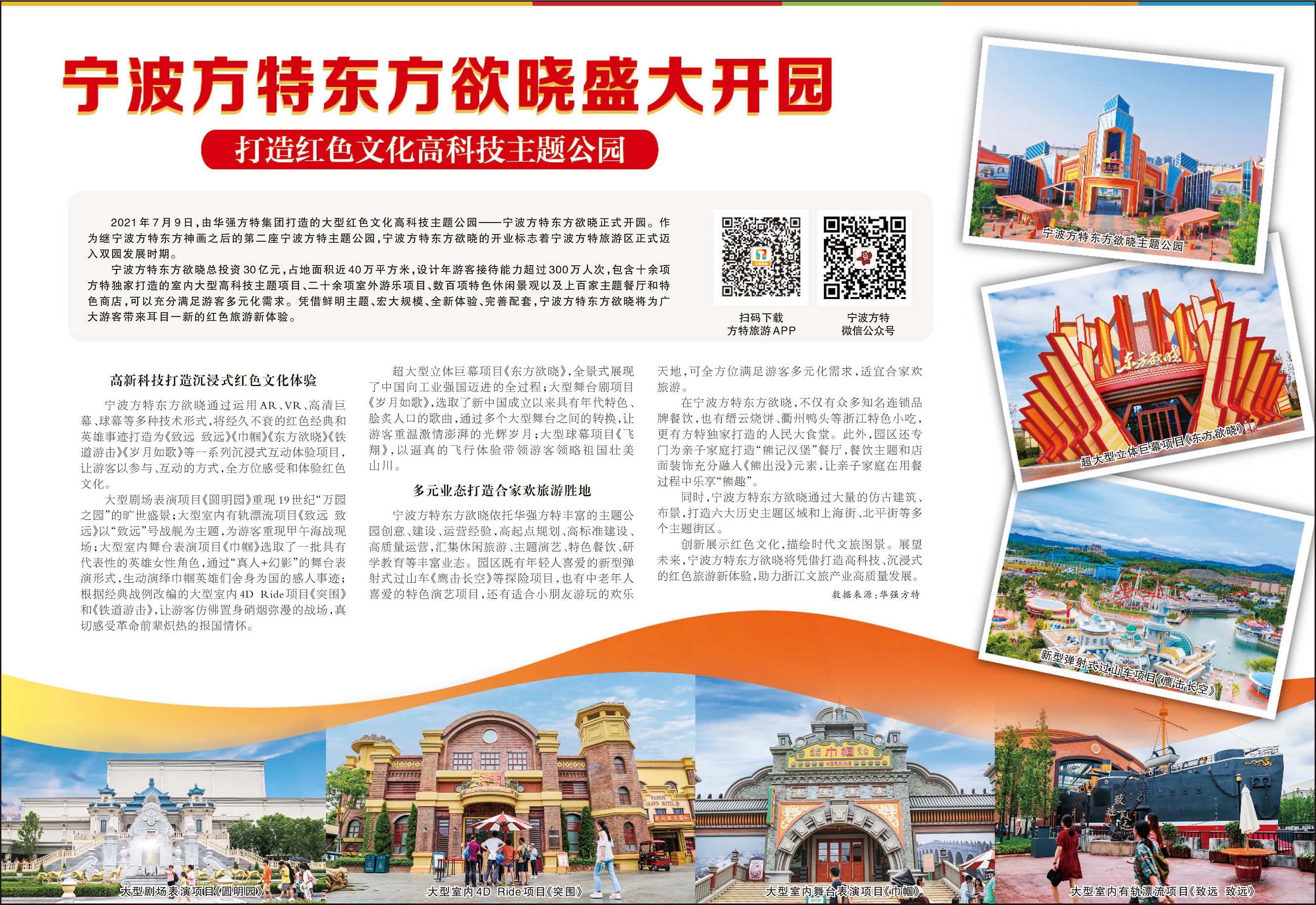 2021年7月9日,由華強方特集團打造的大型紅色文化高科技主題公園——寧波方特東方欲曉正式開園。作為繼寧波方特東方神畫之后的第二座寧波方特主題公園,寧波方特東方欲曉的開業標志著寧波方特旅游區正式邁入雙園發展時期。寧波方特東方欲曉總投資30億元,占地面積近40萬..