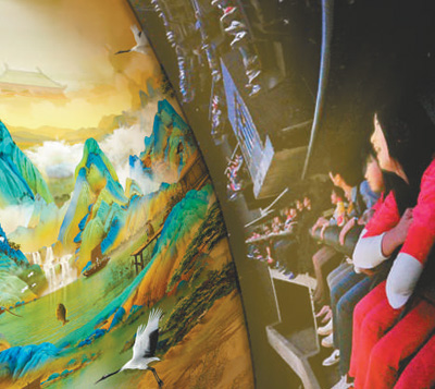 游客在方特主題樂園體驗《飛越千里江山》資料圖片“去年我有幸在故宮‘歷代青綠山水畫特展’上觀賞了中國十大傳世名畫之一的《千里江山圖》,那氣吞山河的氣勢讓人震撼不已,今天沒想到能夠再次領(lǐng)略到這古代青綠山水巔峰之作的美妙意境。”一位剛觀看完中國畫球幕飛翔影..